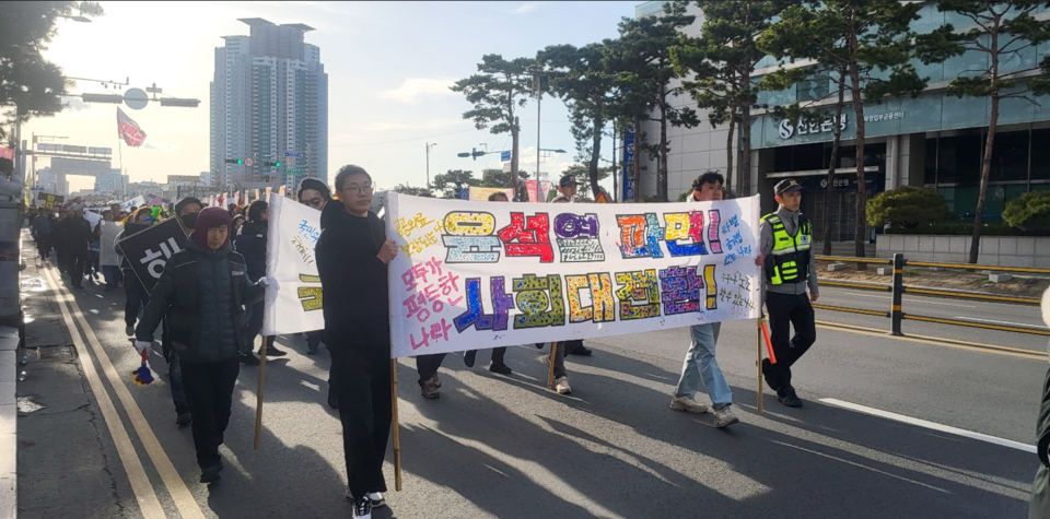 참가자들은 청주 시내를 행진하며 거리를 지나는 시민들에게 윤석열 탄핵과 국민의힘 해체 필요성을 알렸다.