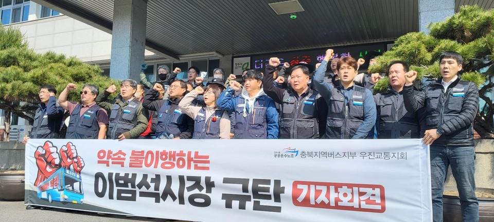 민주노총 공공운수노조 충북버스지부 우진교통지회는 1일 청주시청 앞에서 기자회견을 열고, 약속을 일방적으로 이행하지 않는 이범석 청주시장을 규탄했다.