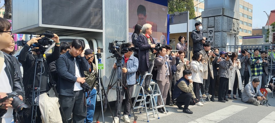 이들은 ‘윤석열 탄핵’, ‘8대 0파면’을 외치며 11시가 되길 기다렸다. 탄핵 심판 선고가 발표되는 순간 도민들의 모습을 포착하기 위해 모여든 기자들도 수십 명에 이르렀다.