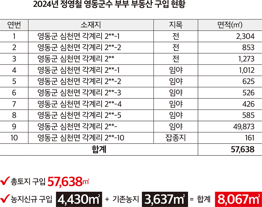 정 군수 부부는 이미 농지 3637㎡를 보유하고 있던 상태로, 신규로 구입한 농지까지 포함하면 8607㎡(2608평)에 달한다.