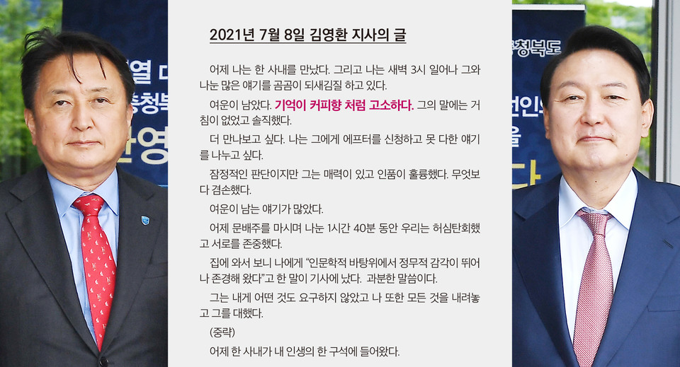 지난 2021년 7월 8일, 김영환 충북도지사는 페이스북에 글을 올렸다. 하루 전날 당시 대통령선거 출마를 선언했던 윤석열과 만난 뒤 그 소회를 담은 이야기였다.