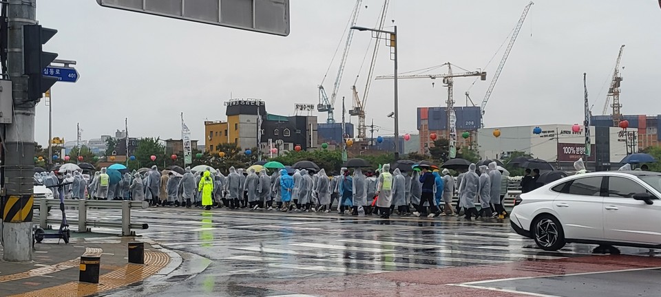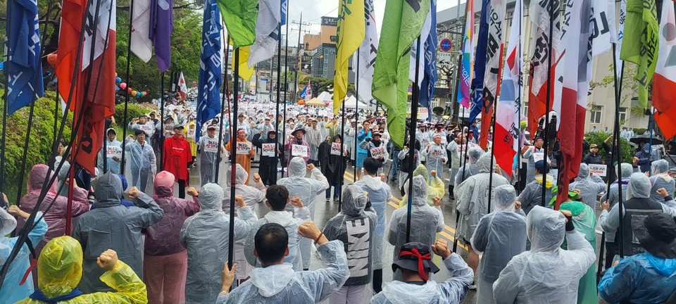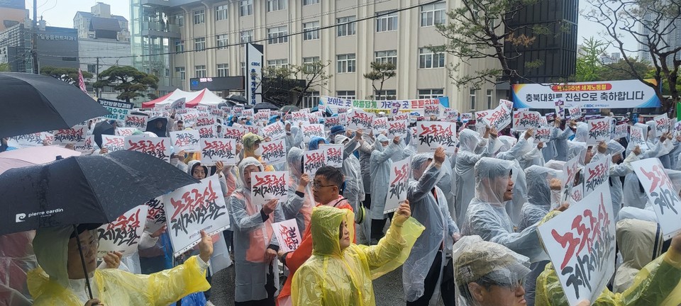 이날 민주노총 충북지부 조합원 및 산별노조 조합원 3000여 명은 비가 오는 가운데서도 집회와 행진을 이어갔다.