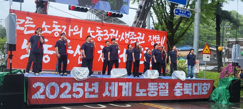 발언 이후에는 △공무원 △건설 △서비스 △화섬 △공공 △대학 △사무 △교육청 △보건 △전교조 등 산별노조 대표자 11명이 ‘2025 세계 노동절 충북 노동자대회 결의문’을 낭독했다.