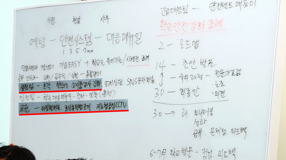 해당 사진에서 옆 칠판에 △인성시민과 △총무·인사과 △생활팀 △안전팀 △교권(교권보호지원센터) 등 각 부서의 팀장들이 낸 아이디어를 정리한 내용이 나온다.