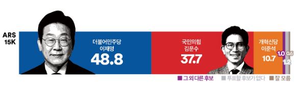 김문수 후보는 37.7%로 이재명 후보와 11.1%p 격차를 보였다.