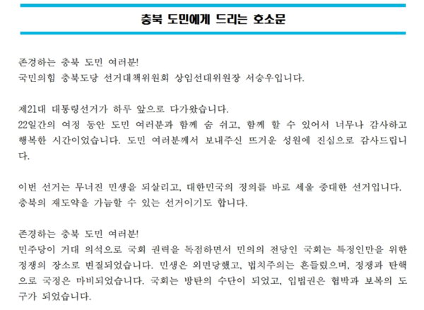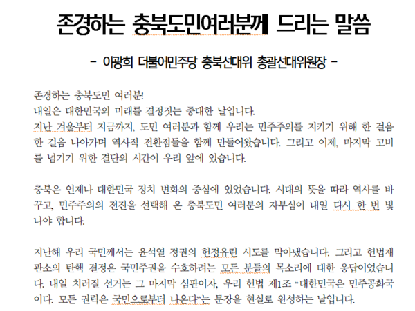 더불어민주당 충북선대위 이광희 총괄선대위원장은, 2일 ‘존경하는 충북도민 여러분께 드리는 말씀’이라는 제목의 글을 발표했다.