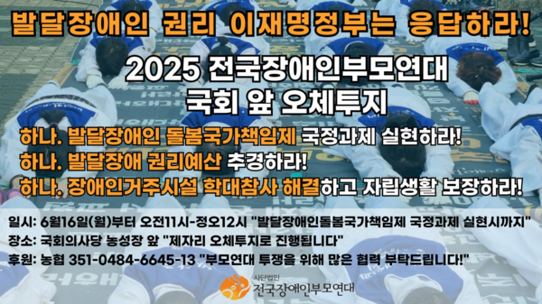 전국장애인부모연대는 16일 오전 11시를 시작으로 △발달장애인 돌봄 국가책임제 국정과제 실현 △2025년 발달장애 권리예산 추경 △장애인 거주시설 자립생활 권리보장 등을 위해 무기한 100배 제자리 오체투지를 진행한다고 밝혔다.