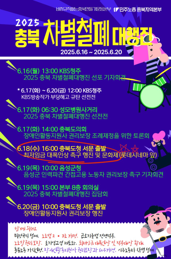 비정규직충북본부는 이날 선포 기자회견을 시작으로, 17일에는 충북도의회에서 ‘장애인활동지원사 권리보장 조례제정을 위한 토론회’를 연다. 18일에는 충북도청 서문에서 ‘최저임금 대폭 인상 촉구 행진 및 문화제’를, 19일에는 음성군청 앞에서 ‘음성군 인력파견 간접고용 노동자 권리보장 촉구 기자회견’과 ‘충북 차별철폐대행진 집담회’를 연다. 20일에는 ‘장애인활동지원사 권리보장을 위한 행진’을 진행한다.