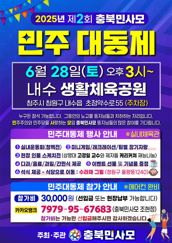 충북민사모(민주주의와 민주당을 사랑하는 충북사람들의 모임)가 오는 28일 오후 3시부터 내수생활체육공원 실내체육관에서 ‘제2회 민주대동제’를 연다.