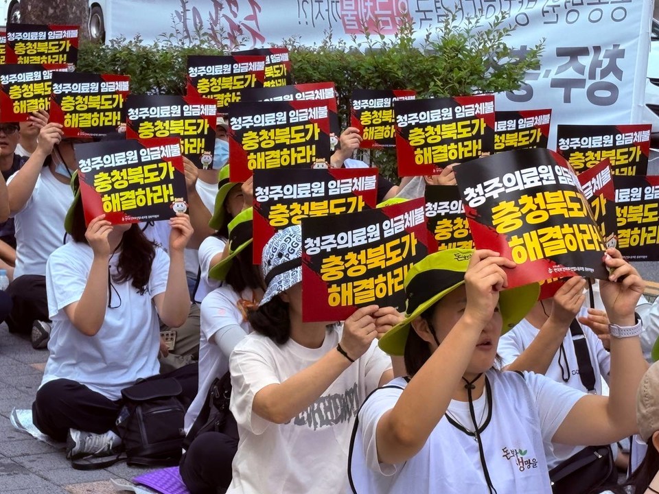 결의대회를 통해 노조는 '임금체불 즉각 해결' '공익적 적자 해결' '청주·충주의료원 회복기 지원 예산 편성' '공공의료 강화'를 충북도에 요구했다.
