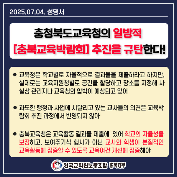 전교조 충북지부는 4일 성명을 내고, 충북교육청의 일방적 충북교육박람회 추진을 규탄한다고 밝혔다.