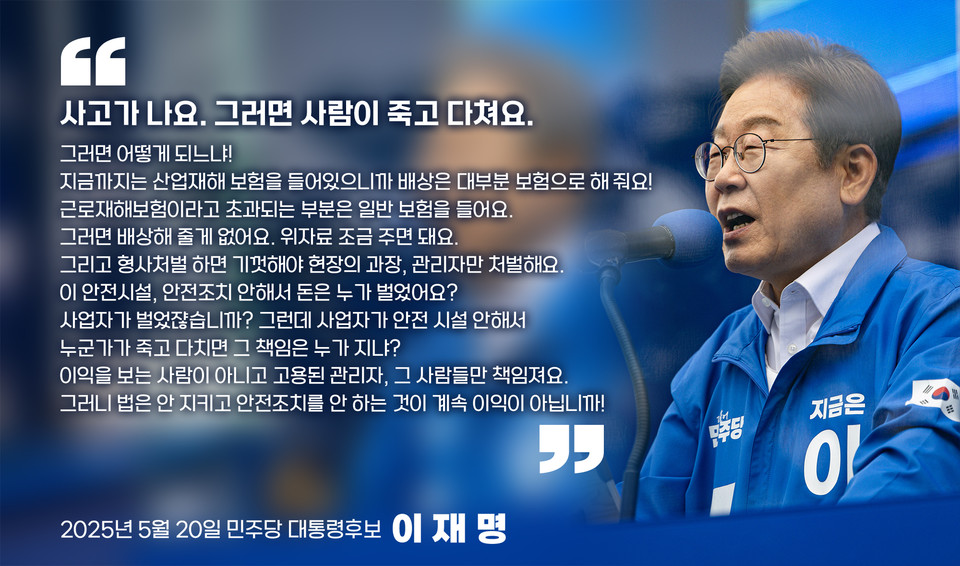 이재명 대통령이 유세 도중 “사업주가 안전 시설 안 해서 누군가가 죽고 다치면 책임은 누가 지냐? 고용된 관리자 그 사람들만 책임져요”로 라는 말도 ㈜아리셀화재참사와 100% 상통한다.
