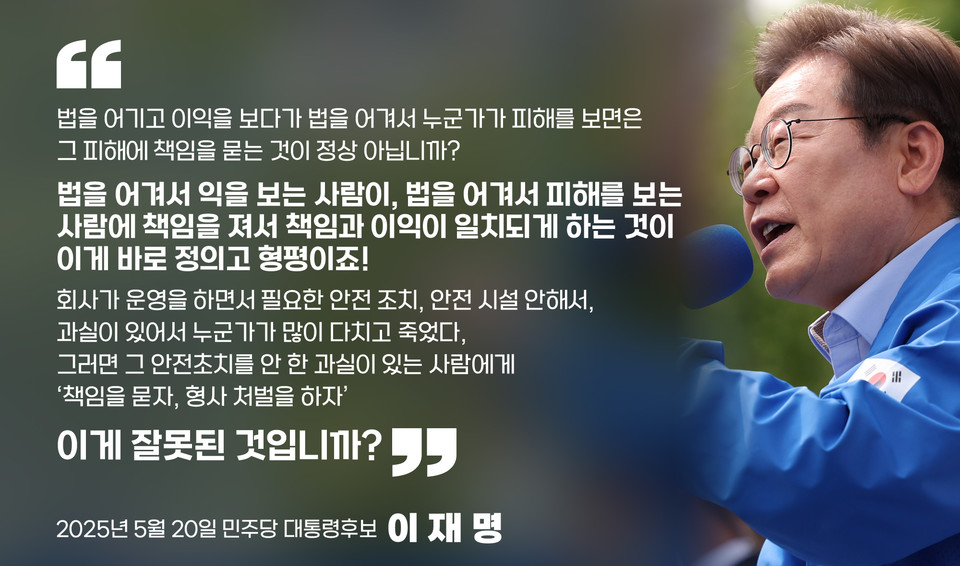 이재명 대통령도 “안전 시설을 안해서 누군가가 많이 죽었다. 그러면 그 과실이 있는 사람에게 ‘책임을 묻자. 형사 처벌을 하자’ 이게 잘못된 것입니까?”라고 지극히 상식적인 질문을 했다.