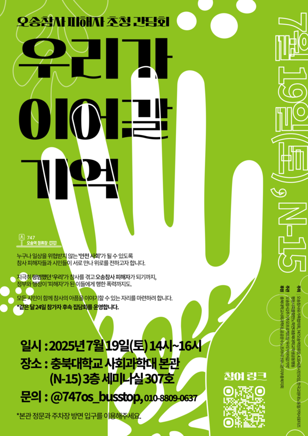 충청지역 20~30대 청년 10여 명으로 구성된 ‘747오송역정류장’은 오는 19일 충북대학교 사회과학대 본관 세미나실에서 유가족들을 초청, ‘우리가 이어갈 기억’ 간담회를 진행한다.