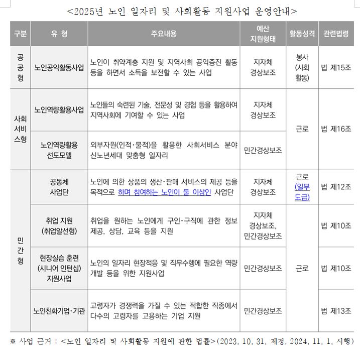 보건복지부는 ‘2025년 노인 일자리 및 사회활동 지원사업 운영안내’에서 <노인 일자리 및 사회활동 지원에 관한 법률>(2024. 11. 시행)을 근거로 사업 유형을 공공형ㆍ사회서비스형ㆍ민간형으로 구분했다.