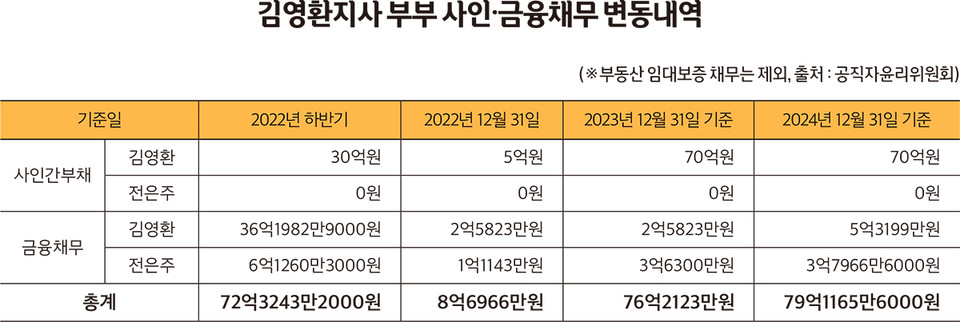 2024년 12월 31일 기준 김영환 지사와 부인 전은주씨가 신고한 채무액은 총 79억1165만6000원이다.