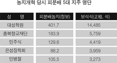 당시 민영은 일가와 비슷한 규모의 토지를소유한 이는 청주대학교를 설립한 김원근씨가 출연해 만든 대성학원(401정보) 뿐이었다.