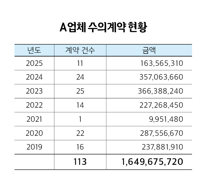정영철 군수가 취임하기 전인 2021년에는 단 1건, 2020년에는 2건을 수주했는데 정영철 군수가 취임 한 뒤인 2023년과 2024년에는 각각 25건과 24건 등으로 수의계약 건수와 금액도 크게 늘어났다.