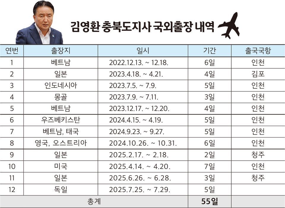 김 지사의 국외출장 기간은 55일에 달했다. 12번 국외 출장을 떠나면서 청주공항은 단 2회 이용했다.