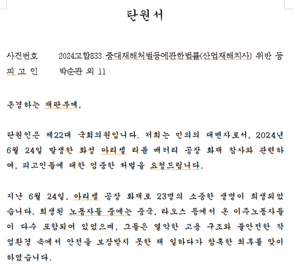 아리셀 중대재해 참사 형사 1심 선고를 앞두고, 국회의원 25명이 재판부에 엄중 처벌을 촉구하는 탄원서를 제출했다.