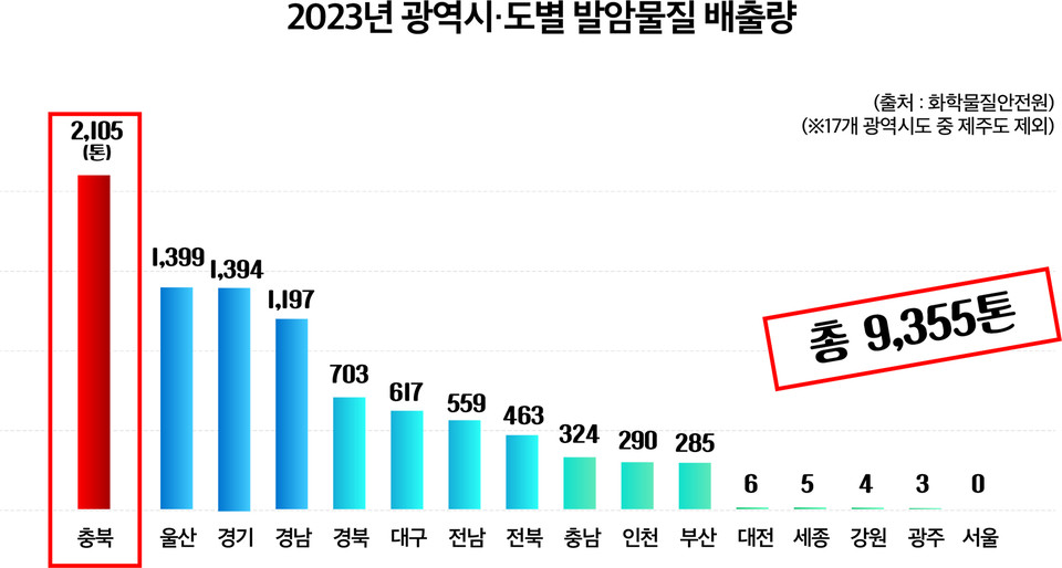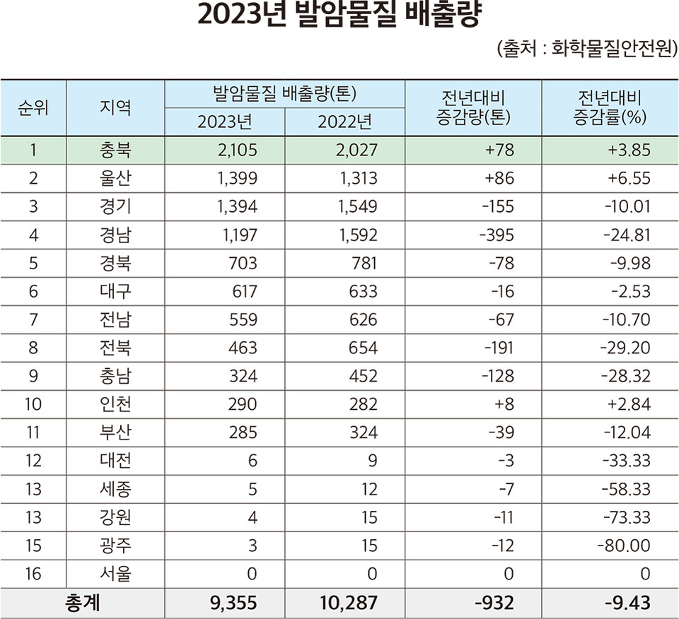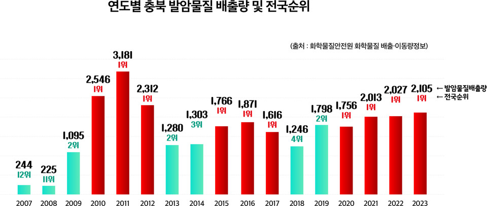 1705톤(2020년), 2013톤(2021년), 2027톤(2022년)을 배출해 3년 연속 발암물질 배출량 1위 를 기록한 충북도는 4년연속 1위라는 오명을 이어가게 됐다.