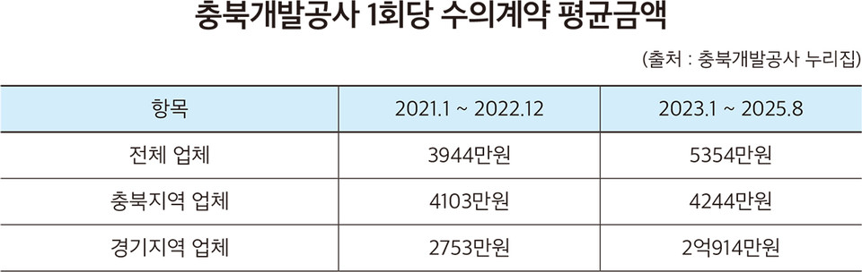 반면 충북개발공사의 경우 충북 업체는 수의계약 한건당 평균 4244만원, 경기지역업체는 2억914만원을 기록했다.