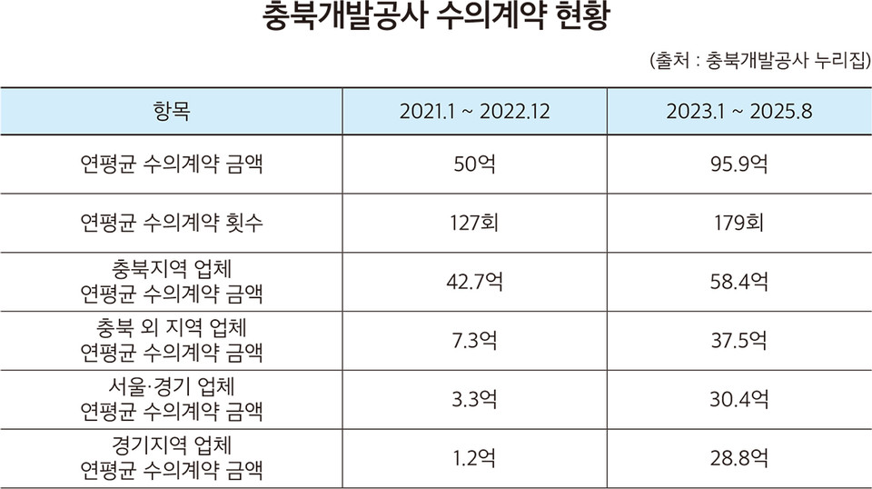 2021년과 2022년 충북지역 업체는 연간 수의계약 50억원 중 42억7000여만원을 받았다.