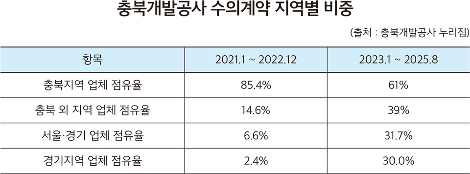 충북지역 업체의 수의계약 점유 비중이 크게 낮아진 데 비해, 경기지역 업체의 점유 비중은 전임 이시종 지사 시절 2%대에서 30%로 크게 높아졌다.
