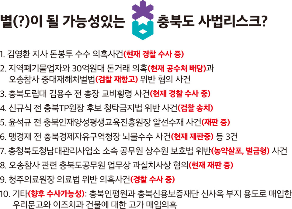 일곱 개의 별(?)로 거론되는 사건은 먼저 김영환 지사와 연관된 △ 김영환 지사 돈봉투 수수 의혹사건(현재 경찰 수사 중) △ 지역폐기물업자와 30억원대 돈거래 의혹(현재 공수처 배당)과 오송참사 중대재해처벌법(검찰 재항고) 위반 혐의 사건이 있다.