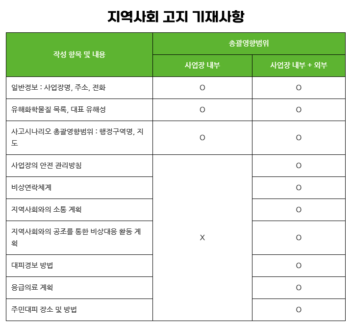 업체는 사업장명칭과 담당자 연락처, 유해화학물질의 목록 및 유해성, 비상대응 활동계획, 대피경보 및 주민 대피 장소와 방법등을 기재해 주민에게 고지해야 한다.