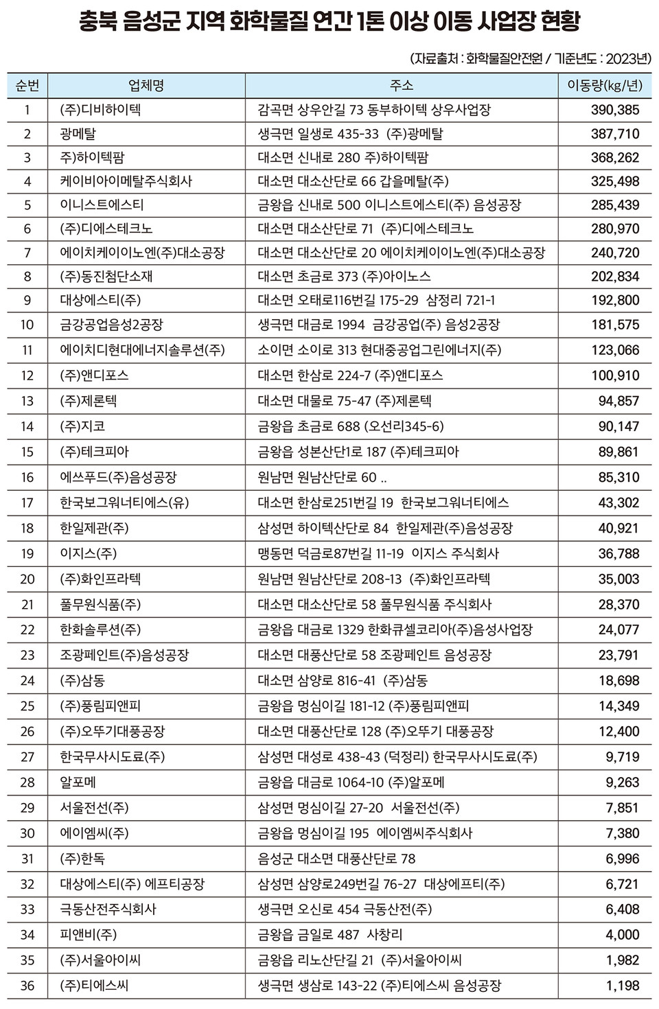 화학물질안전원이 올해 공개한 이동배출량 시스템에는 음성군 소재 91곳의 화학물질 정보가 포함됐다.