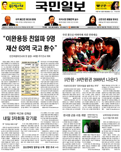 ▷한겨레 -1면 <친일파 땅 환수…62년만에 '단죄'> -6면 <을사조약·한일합병 대가로 작위·은사금 '전형적 매국형'/땅팔아 대부분 현금화…환수재산 1%안돼> <"내 땅 내놔" 국가상대 소송 35건> <452명 선별·가계도 작성…60년 '역추적'/9개월간 어떻게 조사했나> <환수친일재산으로 '독립유공자' 지원> -31면 사설 <친일 재산 환수는 '정의의 심판' 첫걸음이다>