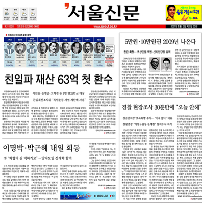 ▷서울신문 -1면 <친일파 재산 63억 첫 환수> -3면 <이완용 재산 등 환수…58년만의 '친일청산' 첫 가시적 성과/"법 시행후 처분 땅도 국가 귀속"> <"452명 명단 작성…확인후 추가환수"/김창국 조사위원장 문답> - 31면 사설 <친일파 재산환수 이제 시작이다>