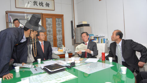 이날 오후 괴산군을 방문한 활빈단원 5명은 임 군수에게 ‘해괴한 상(賞)을 제정함으로써 대한민국 공직자와 3만 괴산군민의 명예를 실추시킨 괴산군의 행위를 규탄한다’는 내용의 음주상 중단촉구 항의문을 전달했다.