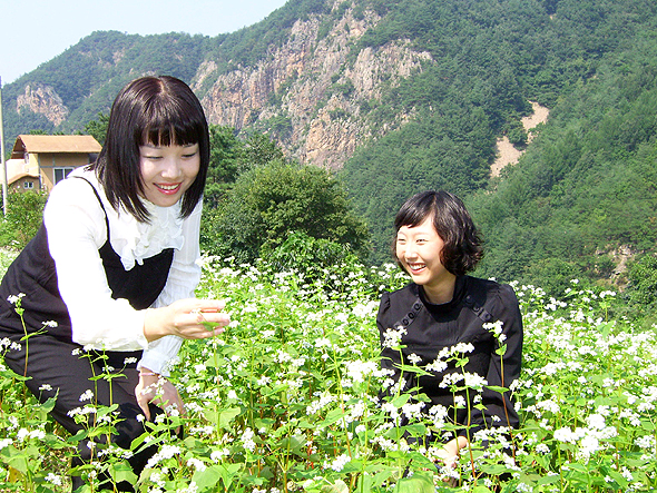 충북 보은군 내속리면 구병리 '아름마을'은 오는 14일부터 16일까지 마을 자체적으로 메밀꽃 축제를 개최한다. 11일 오전 활짝 핀 메밀꽃밭에서 젊은 여성들이 새하얀 메밀꽃밭의 정취에 흠뻑 빠져있다.