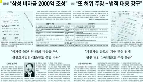중앙은 6면에는 김 변호사와 삼성의 주장을 동일한 크기로 나란히 실었다. 김 변호사와 천주교정의구현전국사제단이 이달 초 2·3차 기자회견했을 때와 같은 방식이다. 중앙은 머리기사 위치에 <김용철 "삼성 비자금 2000억 조성"> <삼성 "또 허위 주장…법적 대응 강구">를 배치했다.
