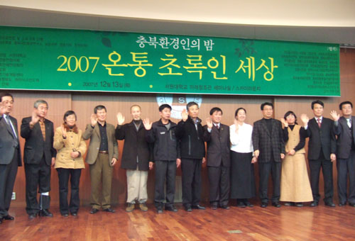 청주충북환경운동연합은 지난 13일 ‘충북환경인의 밤’ 행사를 열고 2007충북환경대상 시상식을 가졌다. 청주충북환경운동연합은 지난 95년 충북환경대상을 제정해 99년을 제외한 매년 사회 각분야의 환경 지킴이들을 대상으로 시상해왔다. 올해는 제천시와 스파업체의 산악형 리조트 개발사업 반대운동을 벌여온 백운명 평동2리 주민들에게 대상을 전달했다. 또한 2007년 10대 환경뉴스를 다음과 같이 선정 발표했다. ▲청주 가로수길 보전운동 ▲경부운하 건설 공약 폐기 운동 ▲세계적 휘귀어종 미호종개 서식지 복원 노력 ▲청주시 음식물 쓰레기 처리방식 허점 ▲진천 석면처리공장 반대 주민운동 ▲제천 백운 리조트개발 주민반대운동 전개 ▲제천 단양지역 쓰레기시멘트 논란 ▲황새복원센터 황새 본격 방사 ▲산남3지구 원흥이마을 두꺼비 이상증세 ▲친환경적 행복도시 건설을 위한 충청권 공동 대응