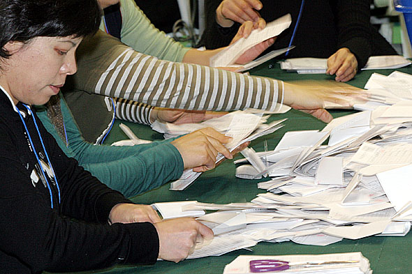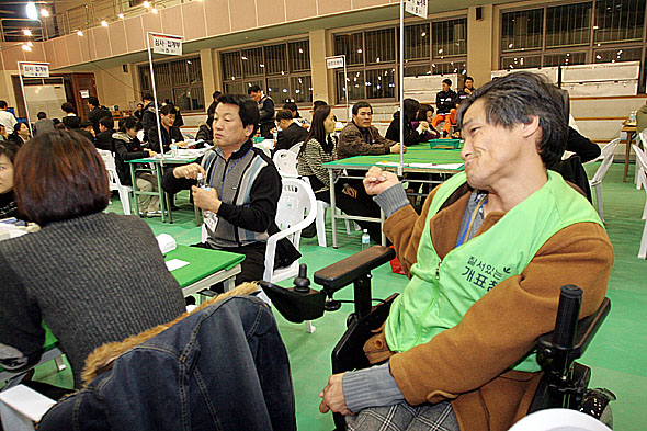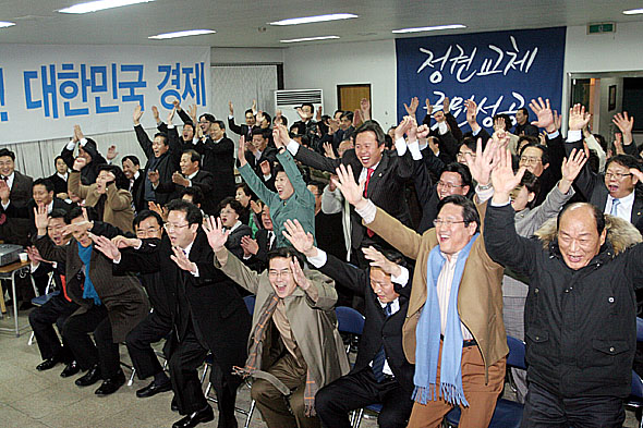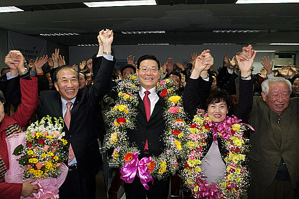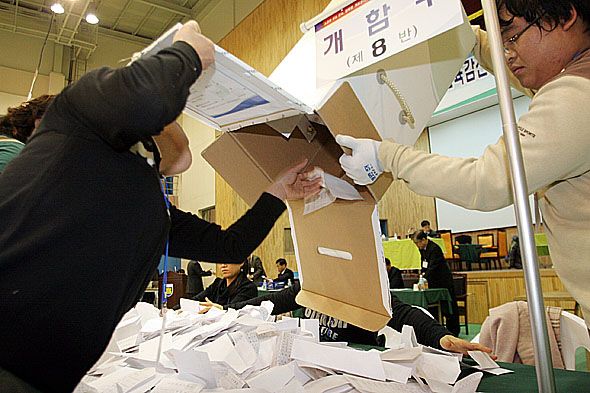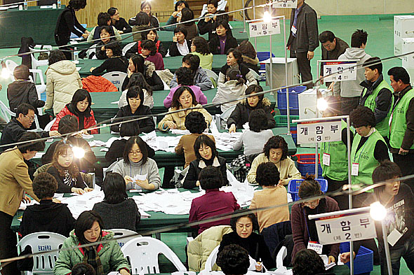 제17대 대통령 선거가 끝났다. 당선자는 승리의 기쁨과 낙선자는 패배의 아픔을 안은 채 힘겨웠던 선거가 막을 내렸다. 한나라당 이명박 후보의 당선소식에 충북도당사에 모인 선대위 간부들과 지지자들이 일제히 일어나 환호하고 있다. ▲ 텅 빈 대통합민주신당대통합민주신당 충북도당에 모였던 의원들과 지지자들은 방송사 출구조사의 낙선소식에 일찌감치 자리를 비워 몇몇 당원들만 남아 개표방송을 지켜보고 있다. ▲ 이기용 교육감 당선첫 주민 직선제로 대선과 함께 치러진 충북도 교육감선거에서 당선된 이기용 후보가 지지자들과 함께 손들어 환호하고 있다. ▲ 청주시 흥덕구지역 개표소가 마련된 운호고등학교 체육관에 개표종사자들이 투표용지 분류작업을 하고 있다. ▲ 개표원들이 투표함에 마지막 한표까지 확인하고 있다. ▲ 장애인들도 개표 참관인으로 참가했다.