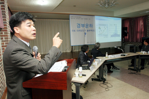 염 처장은 이 자리에서 “한나라당 이명박 대선후보의 핵심 공약인 한반도 대운하는 1000원을 투자해 260원 밖에 못 건지는 사업”이라고 주장했다. 염 처장은 또 “이 후보 측은 한강-낙동강 구간 115개 교량 중 5000톤급 선박 통행이 불가능한 교량 14개만 교체하면 된다고 주장하나 실제 70개 이상의 교량이 교체돼야 할 것으로 추정된다”며 “교량 건설에 개당 500억~4000억원이 소요되는 점을 감안하면 실제 공사비는 기하급수적으로 늘어나게 된다”고 강조했다.