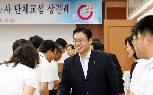 지난 달 27일 충북도청 개청 사상 처음으로 노사가 단체교섭을 하는 일이 있었다. 충청북도와 충청북도공무원노동조합가 도청 소회의실에서 ‘2008년도 단체교섭’을 위한 상견례를 가진 것.