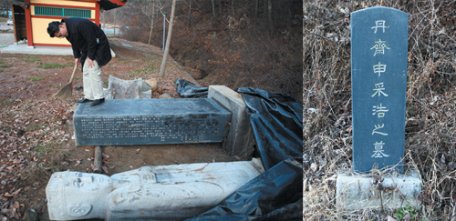 문제는 이 과정에서 1972년 단재의 장남인 수범(1991년 작고)씨가 지역의 인사들과 뜻을 모아 도비로 세웠던 사적비와 1941년 한용운, 오세창 선생이 세운 묘표비가 철거돼 방치되고 있다는 것이다. 72년 사적비는 현재 해체된 채로 사당 초입 공중화장실 인근에 검정비닐에 덮여 방치돼 있다. 또 한용운이 세운 묘표비는 묘역 인근 폐가 앞에 오도카니 세워져 있다.