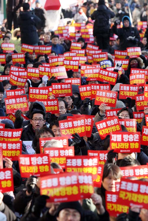 최저기온 영하 8.5도를 기록했던 지난 26일. 여의도 국민은행 앞은 한나라당의 언론 관련법안 처리에 반발, 무기한 총파업의 출정식을 갖기 위해 운집한 전국언론노동조합원 소속 3000여명의 열기로 그 추위를 무색하게 만들었다.