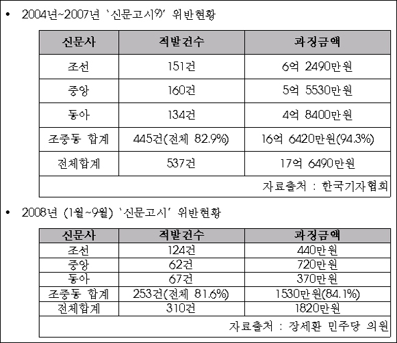 ![]() 첫 번째, 신문법 16조 자료신고 조항. 이미 헌재에서 ‘합헌’이라고 판단했던 것이다. 일간신문을 경영하는 정기간행물 사업자는 발행부수, 유가판매부수, 구독수입, 광고수입 등을 신문발전위원회에 신고하도록 규정하고 있다. 그렇다면 2007년 자료를 신고하지 않아 문화부로부터 과태료 부과를 받은 신문사는 어디일까? <미디어오늘>보도에 따르면, 자료신고를 하지 않은 신문사는 총 19곳이고, 그 중 조선, 중앙, 동아 등을 비롯해 대부분 전국 일간지 및 경제신문들이 포함되어 있다. 두 번째, 독자권익보호 조항. 신문법 목적 1조와 신문사업자의 불공정거래행위를 규제하겠다는 10조 2,3항을 삭제하겠다고 한다. 지난 2004년부터~2008년까지 불공정거래(신문고시 위반)로 과징금을 받은 곳의 80%가 이들 신문들이다. 한국기자협회가 2004~2007년 신문법에 있어서 불공정거래행위 유형 및 기준을 말하는 ‘신문고시’위반현황을 조사한 결과, 전체 적발건수 중 82.9%(532건 중 4455건), 과징금의 94.3%(17억 6490만원 중 16억 6420만원)가 이들 신문에 해당한다. 마찬가지다. 최근 한겨레가 보도한 바에 따르면 장세환 민주당 의원이 최근 2008년 1월~9월까지 ‘신문고시’ 위반사례를 조사한 결과, 조선, 중앙, 동아가 적발건수의 81.6%(310건 중 253건), 과징금액의 84.1%(1820만원 중 1530만원)를 차지했다. 대자본, ‘동네, 지역공동체’상실, 이제 언론까지 이미 많은 토론회를 통해서 한나라당 미디어산업법의 문제점이 논의된 바가 있다. 다양성의 근간이라 할 수 있는 ‘지역성’은 사라지며, 언론의 기본 가치인 ‘공공성’ 또한 돈만되면 만사형통인 ‘산업성’에 묻혀 빛을 발하지 못하게 된다. 대자본이 지역의 생존권을 위협했던 사례 어제 오늘일이 아니다. 대형마트가 들어와서 전통시장 및 골목 상권, 동네 슈퍼를 없애버렸고, 공동체적 감성을 약화시켰다. 자본과 ‘브랜드’로 무장한 프랜차이즈 상가로 인해 변변한 광고조차 할 수 없는 동네 기반 자영업이 어려움을 겪고 있다. 이 흐름이 이제는 언론영역까지 확장되려는 것이다.