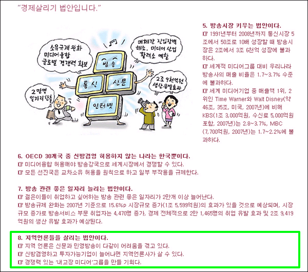 ![]() 지난해 12월 한나라당은 홈페이지 <미디어 산업법|바로알기>를 통해 ‘이 법안은 지역 언론을 살리는 법안”이라며 경쟁력 있는 「내고장 미디어 그룹」을 만들 기회다‘고 제시하고 있었다. 그리고 2월에 와서는 이 내용을 조용히 빼버렸다. 그들은 늘 그랬다. 아마츄어처럼~