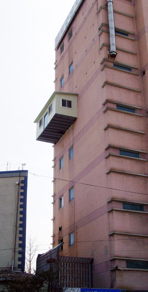 뿐만 아니라 건물 중간에 멋대로 돌출된 모양새는 물론 건물 본체와 전혀 어울리지 않는 색상과 소재까지 흉물을 보듯 밉상이다.