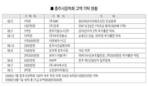 실제 1억원 이상 고액 기탁자들은 충주시 20억원을 제외하면 마주코통상(10억원), 금강주택(3억원), 대영베이스CC(1억5000만원), 상떼힐CC·로하스개발·신한은행·충주기업도시·MIK(각 1억원) 등으로 대부분 골프장과 개발사업 관련 업체들이다.