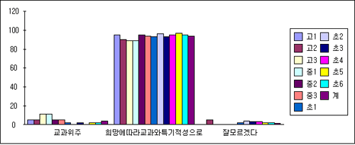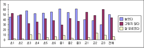 이에 반해 고교 3학년 담임들의 경우 ‘그렇지 않다’는 답변이 60.32%로, ‘그렇다’는 답변 30.16% 보다 2배나 높게 나타나는 등 일제고사 대상이 아닌 초 1,2학년과 고교 1,2,3학년의 경우 ‘늘지 않았다’는 답변이 높게 나타났다.
