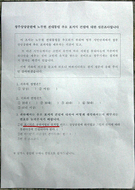 청주시민추모위원회의 상당공원내 노무현 전 대통령 추모표지석 설치를 불허하고 자체적인 시민 여론조사에 나선 청주시가 부정적 이미지를 부각시키는 내용의 전화 설문지를 작성해 논란이 일고 있다. 청주시가 17일부터 실시하고 있는 전화 여론조사는 녹음된 설문지 내용을 듣고 3가지안 중에 자신이 찬성하는 안의 번호 키를 누르도록 했다.