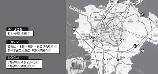 사실 청주시가 이처럼 SOC분야 국비예산 확보에 열을 올리는 데는 다 이유가 있다. 청주·청원 행정구역 통합이나 청주시 독자 발전을 위해서도 도로 접근성은 반드시 필요하기 때문. 시는 물류 교통, 관광 문화의 중심지로 청주시를 키우기 위한 2030프로젝트를 최근 발표했다.