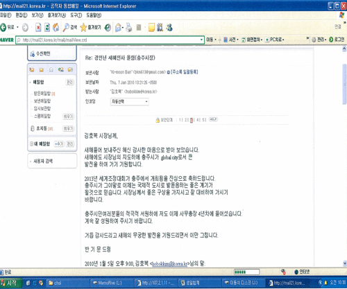 임기 4년차에 접어드는 반기문 UN사무총장이 충주 시민들에게 경인년 새해 인사와 함께 고향발전을 기원하는 정이 담긴 메일을 보내왔다.